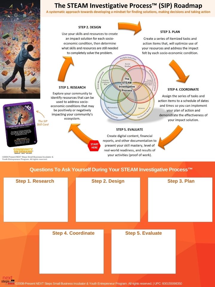 The SIP Roadmap is a strategic implementation framework designed to help students, educators, and workforce development professionals plan, execute, and evaluate projects using the STEAM Investigative Process (SIP). As a core component of Community On Demandâ„¢, the SIP Roadmap provides a structured approach to problem-solving, decision-making, and skill application, ensuring that users successfully complete service-learning projects, entrepreneurial ventures, and workforce initiatives.